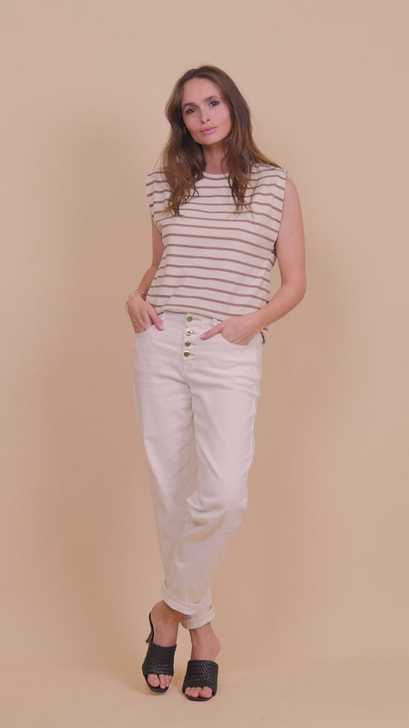 Celebrate understated elegance with this sleeveless striped t-shirt, rendered in cream and brown. The substantial jersey construction ensures durability and structure, while the classic horizontal stripe pattern delivers timeless appeal. A delicate embroidered glitter logo adorns the chest, offering just a hint of sparkle without compromising the refined aesthetic. The round neckline and comfortable straight cut make it endlessly wearable—perfect layered under linen shirts or worn alone for effortless summer sophistication. A wardrobe essential that balances simplicity with subtle refinement.